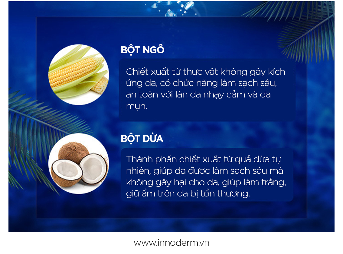 - Sử dụng những nguyên liệu từ thiên nhiên như bột ngô, dừa...cực kì dịu nhẹ cho da nhạy cảm cho những nàng có làn da nhạy cảm nhất. Cảm nhận phương pháp làm đẹp tối tân nhất trong dòng sản phẩm chăm sóc da mặt đình đám tại Hàn Quốc chỉ có tại Dr. Innoderm.