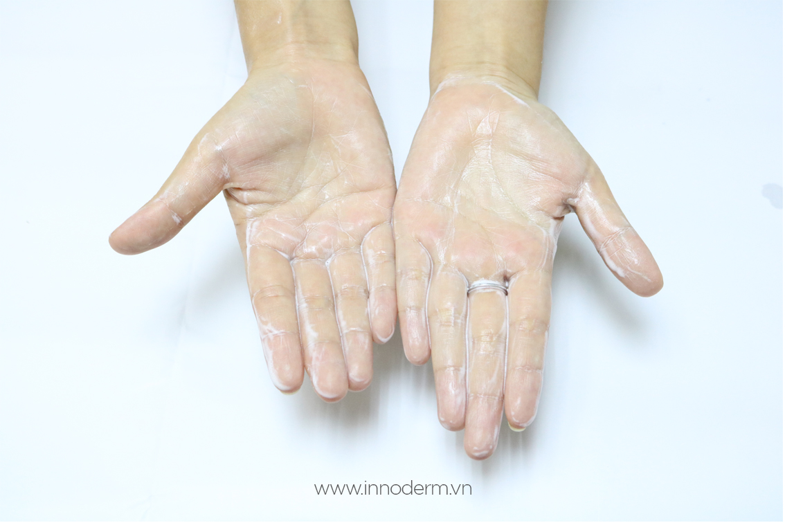 Bước 2: Cho 1 ít nước vào lòng bàn tay, xoa thật nhẹ cho nước hoà vào bột và tạo bọt mịn.